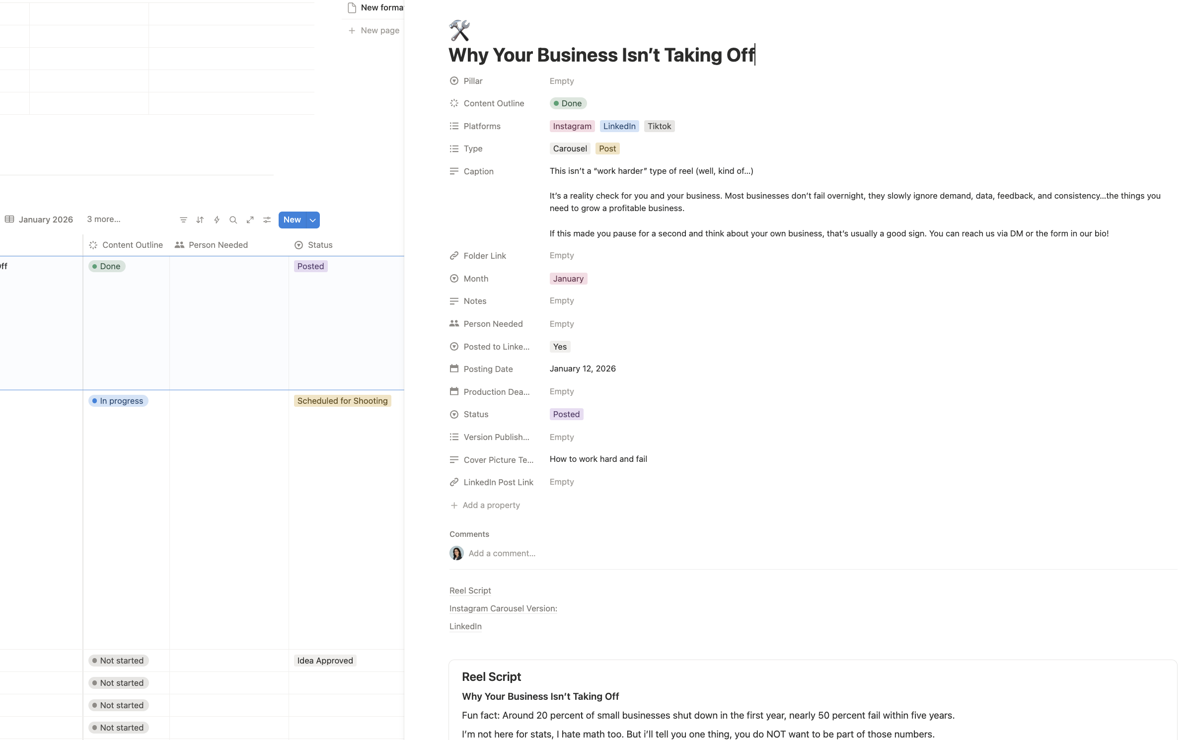 Post tracker with platform, format, and status columns